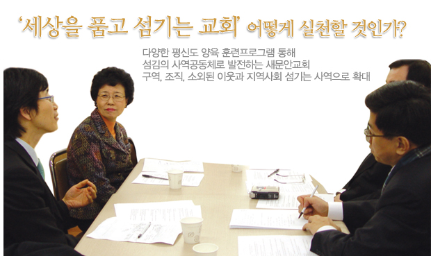 역시 평신도 지도자 양육 훈련을 통한 섬김이 이루어지도록 하면 좋겠습니다. 우리 교회가 새로 개발하기 어려우면 다른 교회의 잘 된 프로그램을 도입하는데 주저하지 말아야 합니다. ≪E새문안≫지가 그런 프로그램을 많이 소개해 주기 바랍니다.