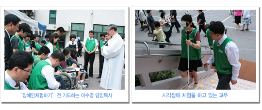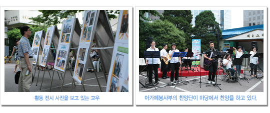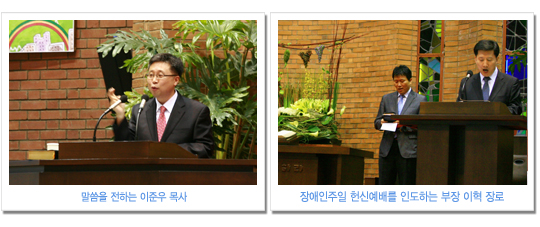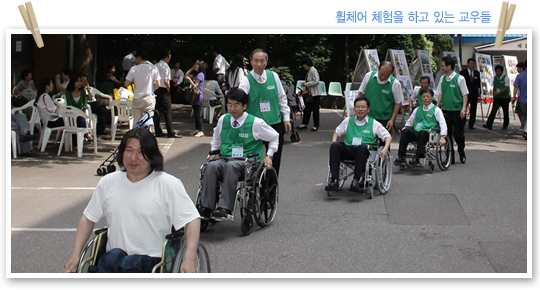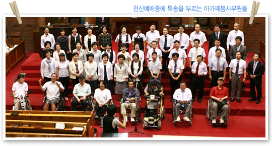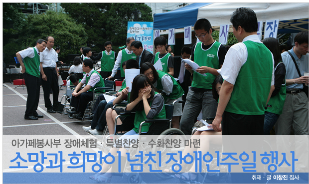 아가페봉사부(부장 이혁 장로)는 매 주일 장애인과 비장애인이 언더우드 교육관 1층에 모여 말씀과 찬양을 통해서 하나님의 사랑을 서로 나누고, “장애인과 비장애인이 함께하는” 표어 아래 이웃사랑을 실천하는 사랑의 공동체이다. 새문안교회는 장애인 주일(6월20일)을 맞이하여 비장애인들을 장애체험에 참여시켜 장애인들의 고통과 불편함을 경험해보고 그들을 이해하며 어떻게 도울 수 있는지를 생각해 보는 시간과 또, 아가페봉사부에 많은 도움의 손길(카풀 · 목욕봉사 · 하계 영성수련회 등)이 요구되는 상황에서 비장애인들이 자발적으로 봉사에 참여할 수 있는 계기가 되기를 바라며 장애체험행사 (휠체어 시각. 목발장애), 마당찬양(아가페찬양팀. 수화찬양), 사진 전시회를 준비하였다고 이혁 장로는 행사의 취지를 밝혔다. 2부 예배 후 이수영 담임목사는 아가페 회원들과 장애체험을 신청한 교우들이 함께한 자리에서 행사를 위한 기도와 기념촬영으로 장애체험 행사가 시작되었고 행사장을 관심 있게 둘러보시고는 장애인들과 관계자들에게 위로와 격려의 말씀도 해주셨다. 뙤약볕 속에서도 아가페 찬양팀이 불편한 지체를 마다하지 않고 온몸과 정성을 다하여 하나님께 영광을 올린 찬양(새 힘을 얻으리 외 2곡)이 교회 마당에 구석구석 울려 퍼질 때는 둘러싼 모든 교우들의 숙연함이 오히려 어색할 정도였다. 저녁 찬양헌신예배에서 이준우 목사(남서울 은혜교회 교육목사)는 “여호와를 앙망하는 자는 새 힘을 얻으리니”라는 말씀 가운데 장애인들이 희망을 품게 하셨고 아가페봉사부가 특별히 준비한 찬송 “기대”를 합창할 때는 진정으로 장애인과 비장애인이 함께하는 모습을 보여준 마음 흐뭇한 은혜의 시간이 되었다. 하루의 행사를 마치며 박철홍 총무는 아가페 봉사부 회원들의 인도로 비장애인들이 장애체험을 통해서 얻은 불편함과 수치심이 오히려 장애인들의 애로사항을 널리 이해하는데 도움이 됐으면 좋겠고 교인들의 관심 가운데 새 성전의 장애시설(휠체어 리프트, 장애인 전용화장실, 노인들의 편의시설 등)이 다른 어떤 교회보다도 편리하게 설계되어 모든 장애인들이 본당에 불편함 없이 드나들며 예배드릴 수 있었으면 좋겠다고 말하였다. ♥ 본의 아니게 장애가 있어 신체적으로 불편한 것은 불편한 것일 뿐 그것을 감안하고 하나님의 영광을 위해서면 무엇이든지 못할 것이 없다는 한마디로 비장애인에게 그 무엇인가를 보여준 가슴 뭉클한 장애주일행사였다. 바라기는 저녁 헌신 예배시간에 신체적 장애를 믿음 생활로 훌륭하게 극복한 장애인을 발굴하여 시상도 하고 격려도 하여 고통과 외로움 가운데 있는 장애인들에게 소망과 희망을 주는 순서가 있었으면 하는 아쉬움이 남는다. 아침부터 열성적으로 행사준비로 수고하신 아가페봉사부 성도님들 한분 한분께 머리가 숙여짐은 물론 이번 행사를 취재하면서 비장애인의 한사람으로, 오히려 장애가 있는 사람들보다 하나님을 온전히 섬기지 못한 나는 어쩌면 영적 장애인 일지도 모른다는 생각이 떠나지 않아 부끄러운 마음을 살며시 감추며 펜을 놓는다. [e-새]